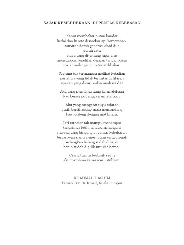 Ghazali lateh banting, 11 jun 2000. Ya, karena kemerdekaan yang kita raih itu memiliki sejarah yang cukup panjang, yang banyak menguras korban jiwa serta harta benda yang telah dilakukan oleh para pahlawan kita. 16 puisi untuk ayah yang indah dan mengharukan. Kamu membakar hutan bandar kedai dan kereta disambar api kemarahan orang tua itu berbisik sedih aku membina kamu meruntuhkan. So, buat sobat sekalian, berikut ini kami sajikan 5 contoh puisi pilihan tentang kemerdekaan yang bisa sobat baca dan cerna makna yang terkandung dalam.